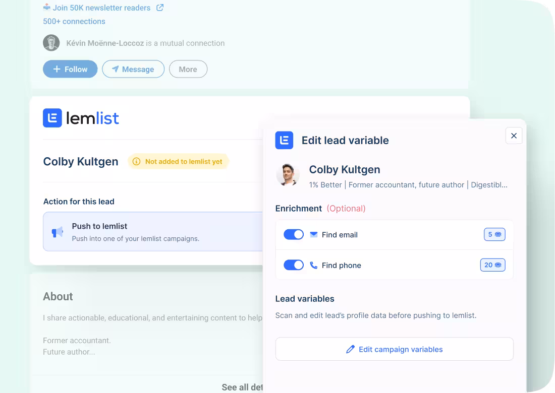 Activate lemlist Chrome extension, go to your lead's LinkedIn profile, and enjoy straightforward enrichment section. No need to jump between apps, tabs, or windows.