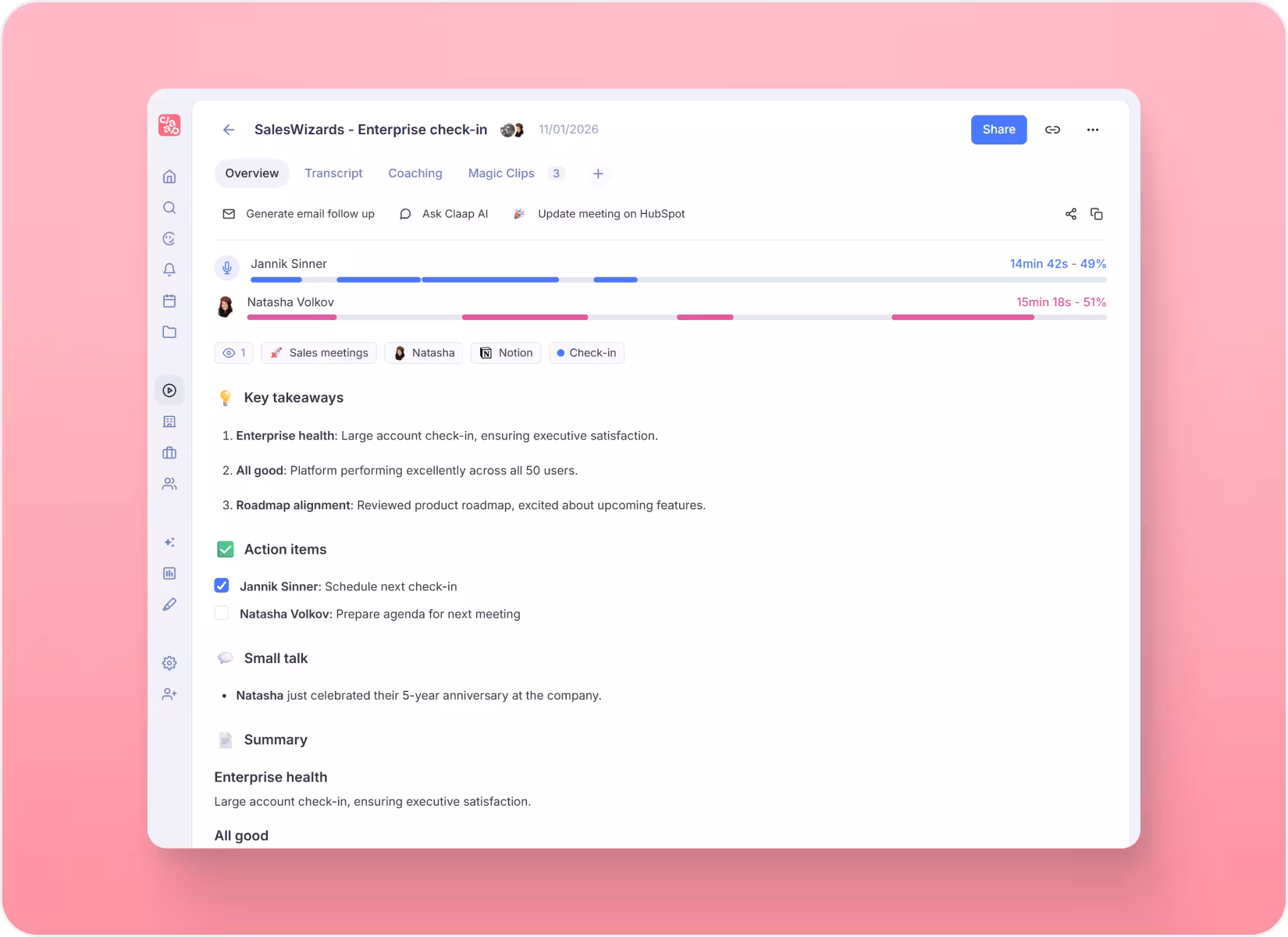 Claap automatically records calls, takes notes, updates your CRM, andcoaches your reps. Your team can finally focus on selling, not admin work.