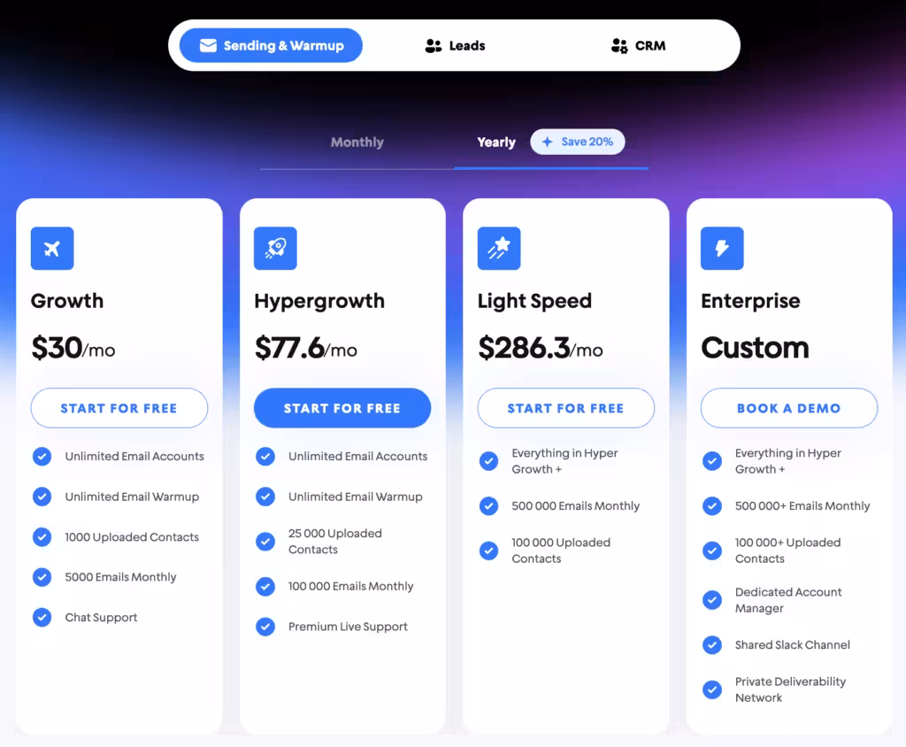 Instantly’s pricing model has become a bit more confusing, as you now have to buy Leads, Campaigns, and CRM separately.
