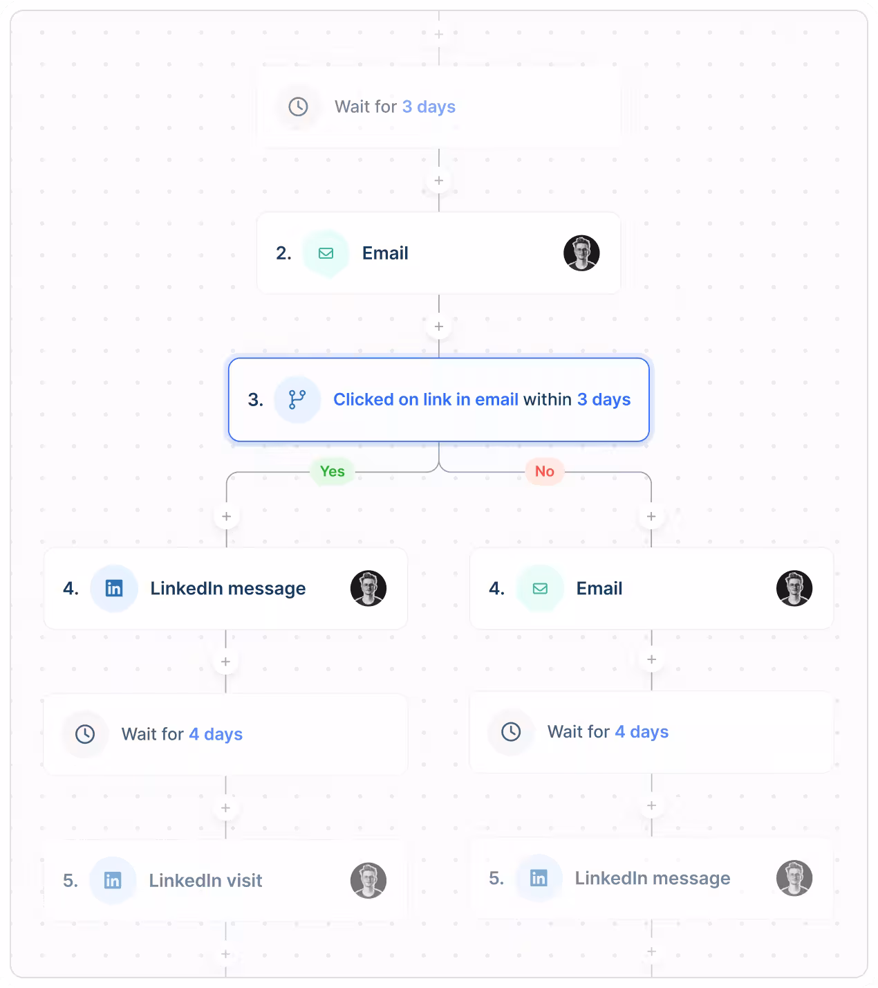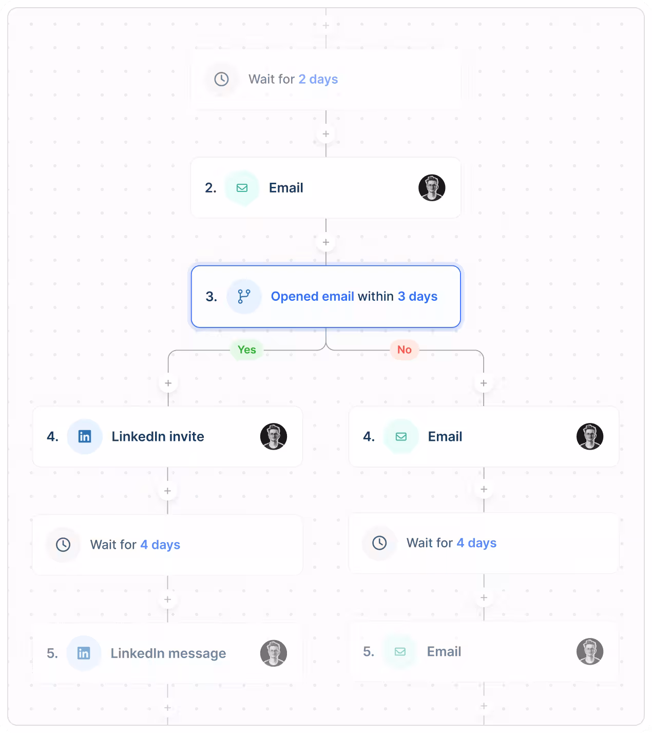 Adding advanced conditions to your outreach helps you engage with your prospects at scale, in a human way, on their preferred channel, when they are most active.