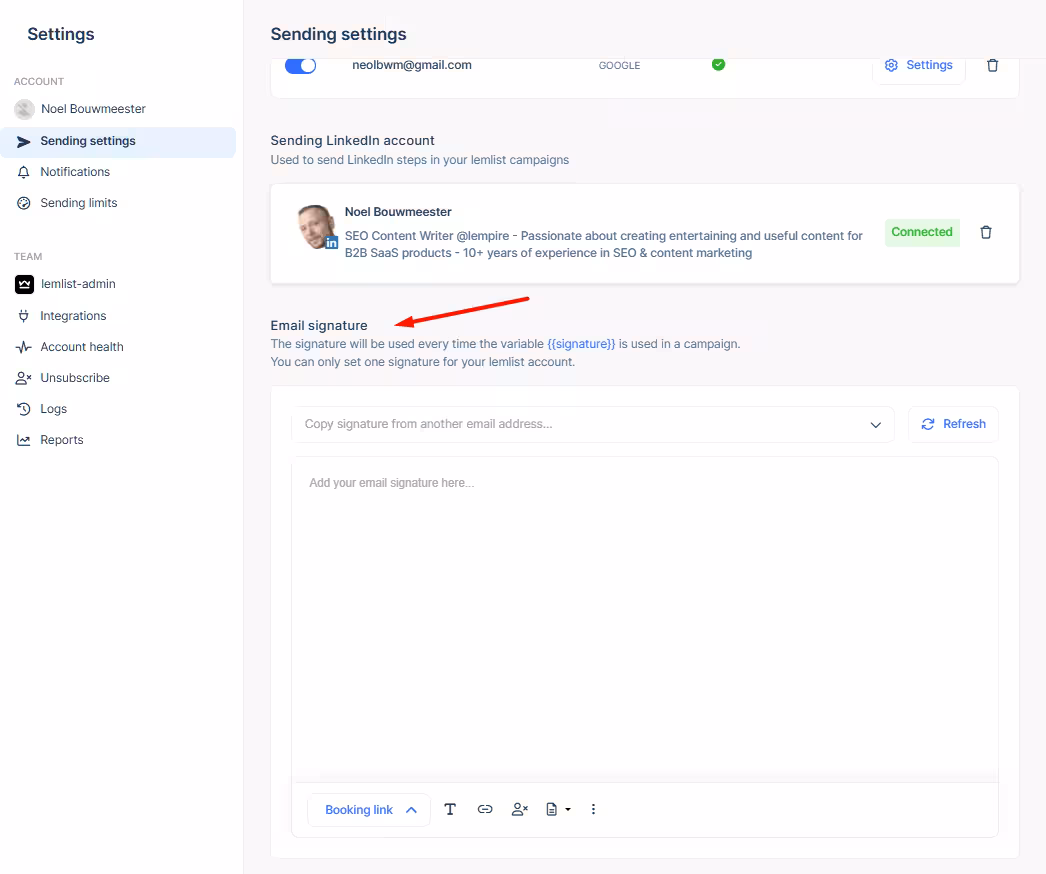 Here’s how to add your new email signature to sales engagement platform lemlist.