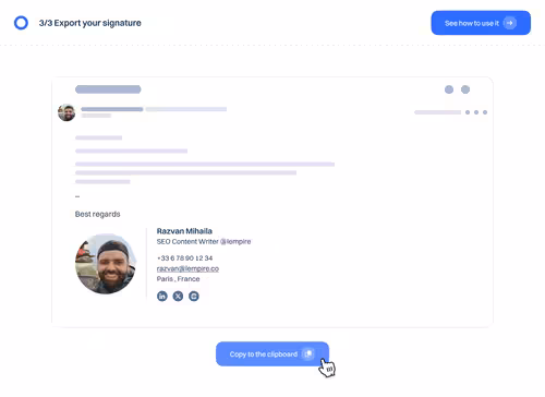 lemlist will now generate your email signature. Click on Copy to clipboard to export your signature.