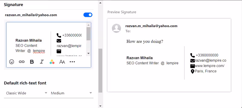 Turn on the toggle below “Signature” and paste your new email signature. Yahoo Mail will preview the signature for you.