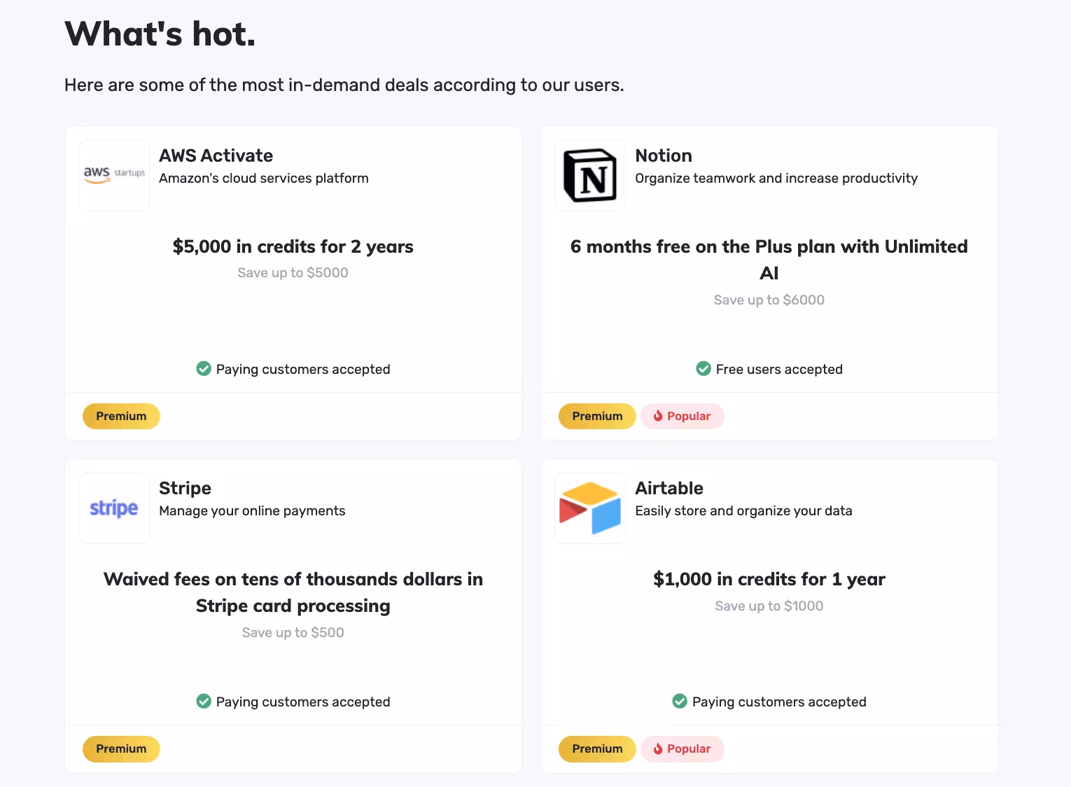 It provides 300+ SaaS deals - offering up to hundreds of thousands in savings - for tools like Notion, Airtable, Stripe, AWS, and more!