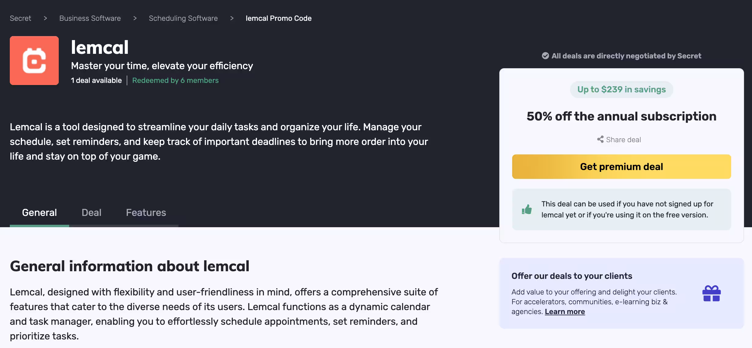 For example, on Secret, you can get 50% off the lemcal annual subscription, saving you up to $239. It's a tool that helps startups to manage their meeting schedules, set reminders, and keep track of important deadlines.