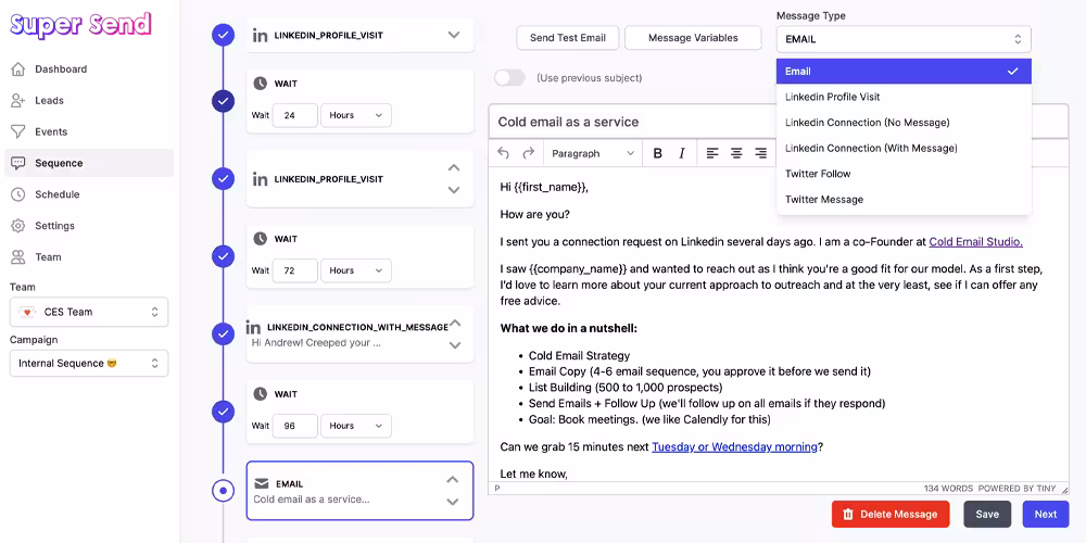 Supersend helps you communicate with your prospects through email, Twitter, and LinkedIn automation. On LinkedIn, you can streamline profile visits, invites, and messages.