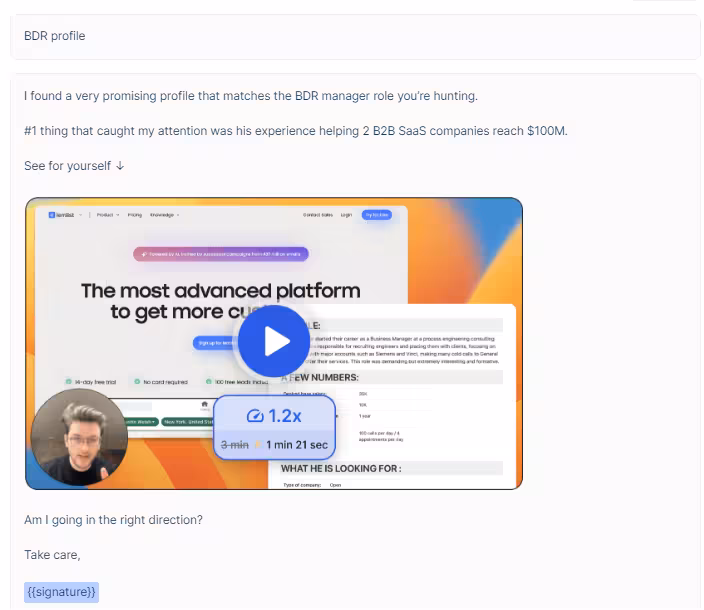 To be more personalized, relevant, and engaging, include a hyper-personalized video that refeerences your target. This will make the email feel unique and special.