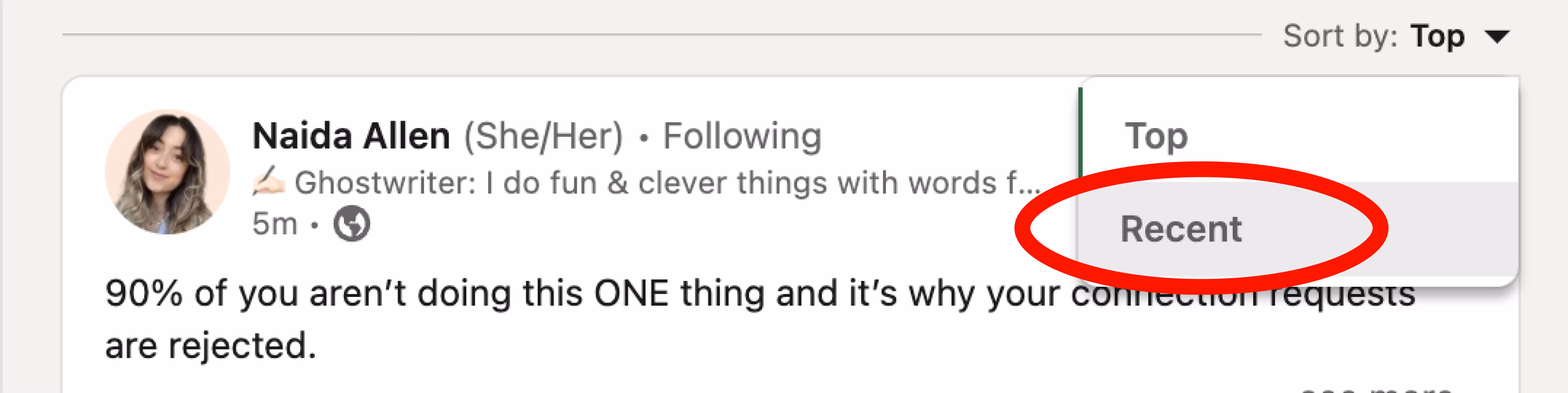 For industry leaders and popular accounts, try to leave your comments as soon as you can on their posts. You can sort your feed by the most recent posts to ensure you’re the first to go to the table.