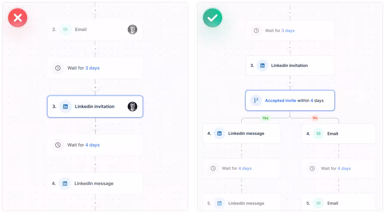 3. Use advanced conditions: Auto-adjust your sequence steps based on leads’ interaction with your campaign without sounding like a robot. For example, If a prospect accepts your connection request, set up lemlist to automatically send a follow-up message, continuing the conversation. For those who don’t respond to your LinkedIn invite, automate an email outreach, offering another touchpoint.