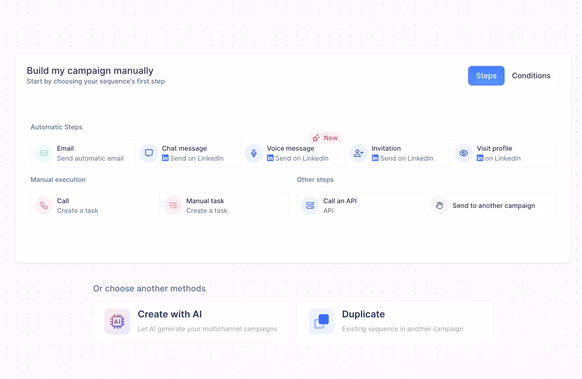 In lemlist, you can add LinkedIn steps to your automated multichannel campaign and auto-adjust next steps based on LinkedIn leads’ interaction with your campaign.