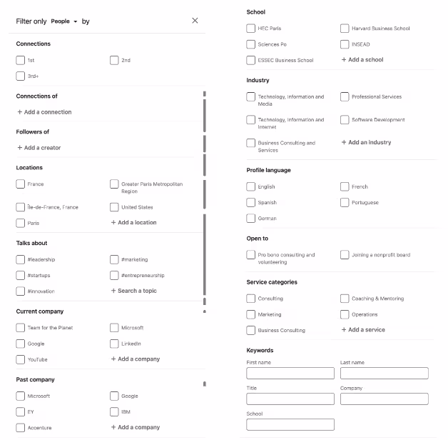 To start your search, visit LinkedIn’s People search page, where you’ll have access to its advanced filters.