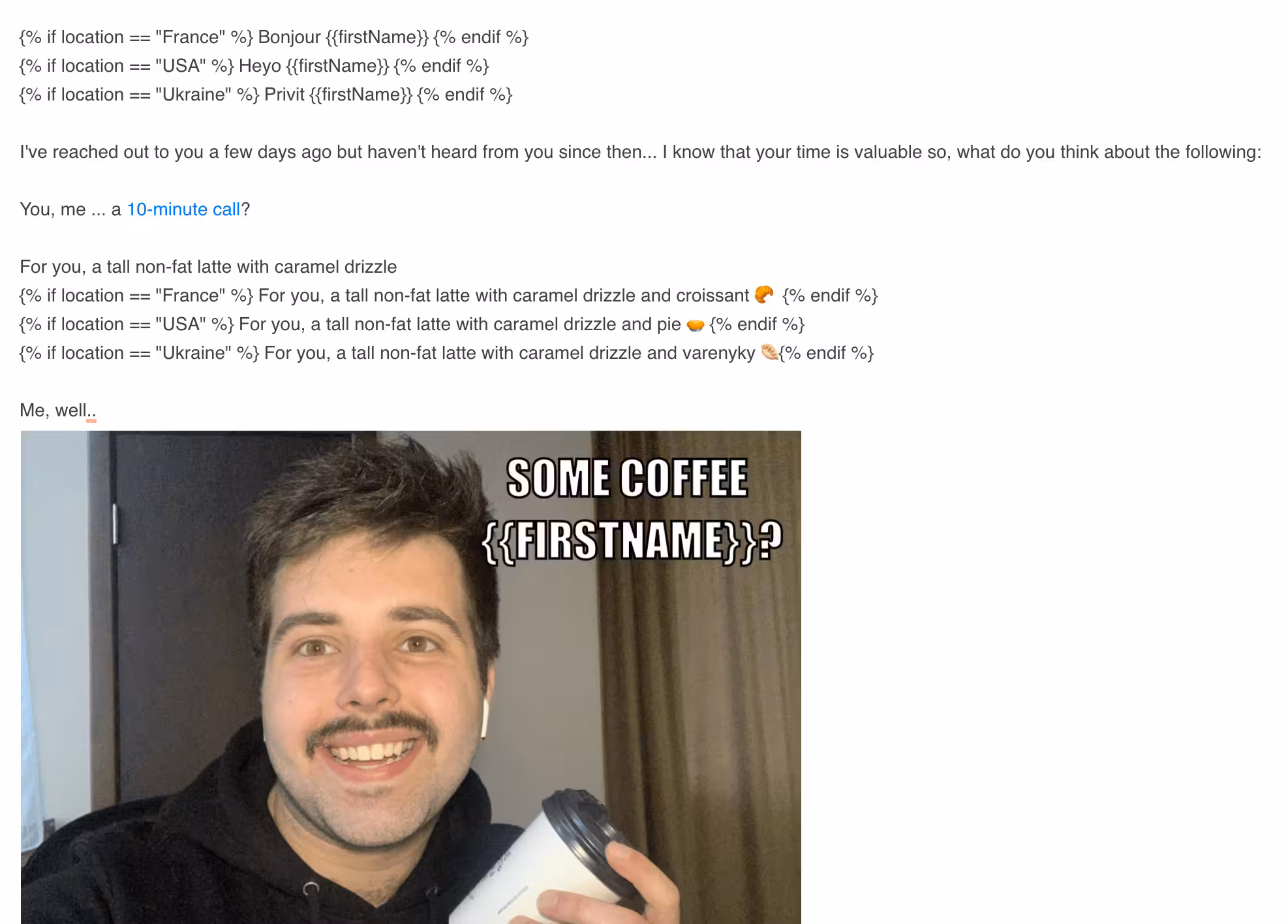 For example, have “Hi {{fistName}}” if the location is the USA, and “Bonjour
