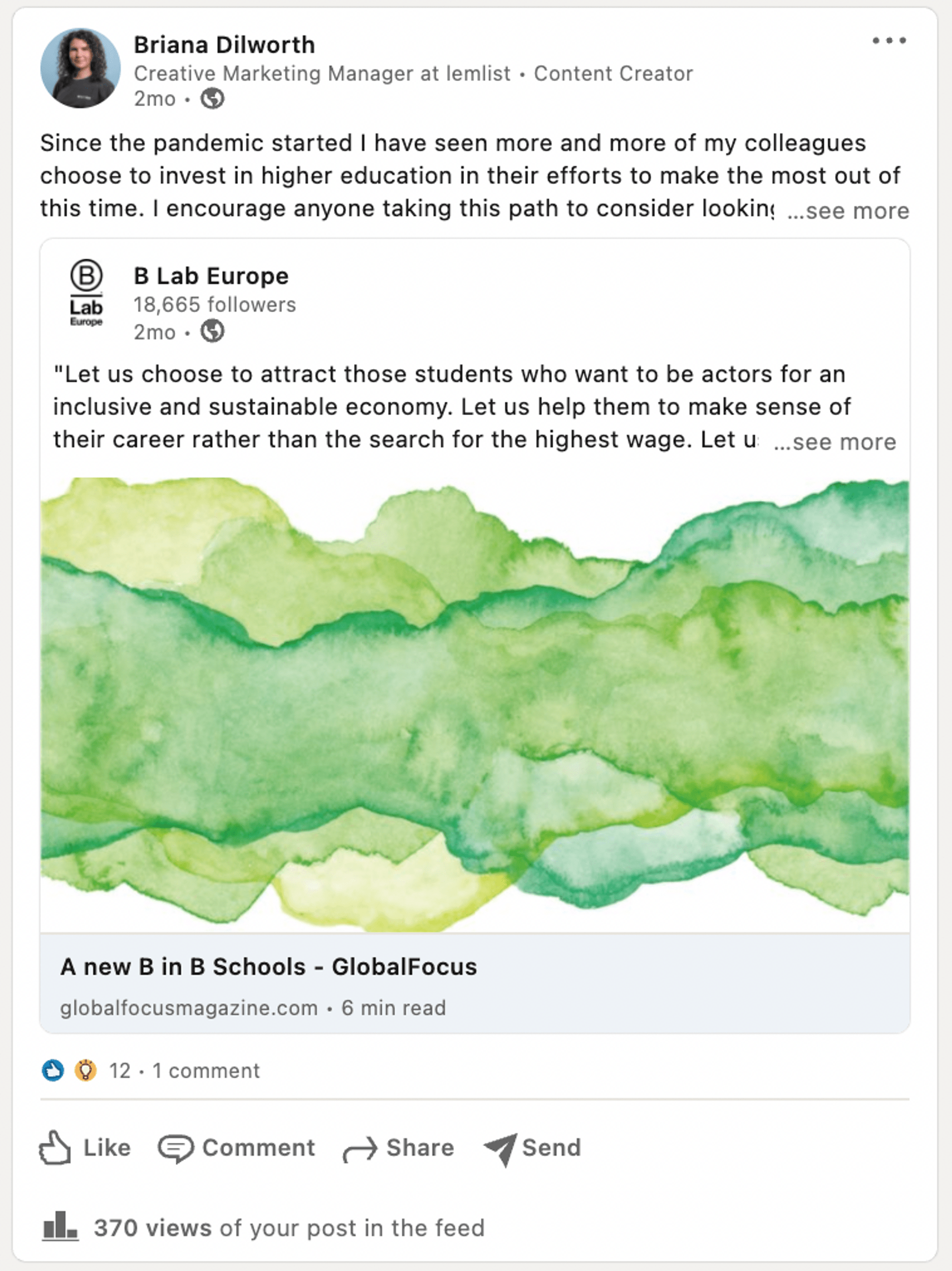 Par exemple, Briana développait sa marque personnelle en tant que Directrice Marketing Créative. Elle a commencé à poster une fois tous les quelques mois, avec une portée organique de seulement 370 vues :