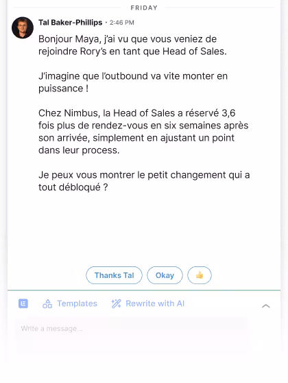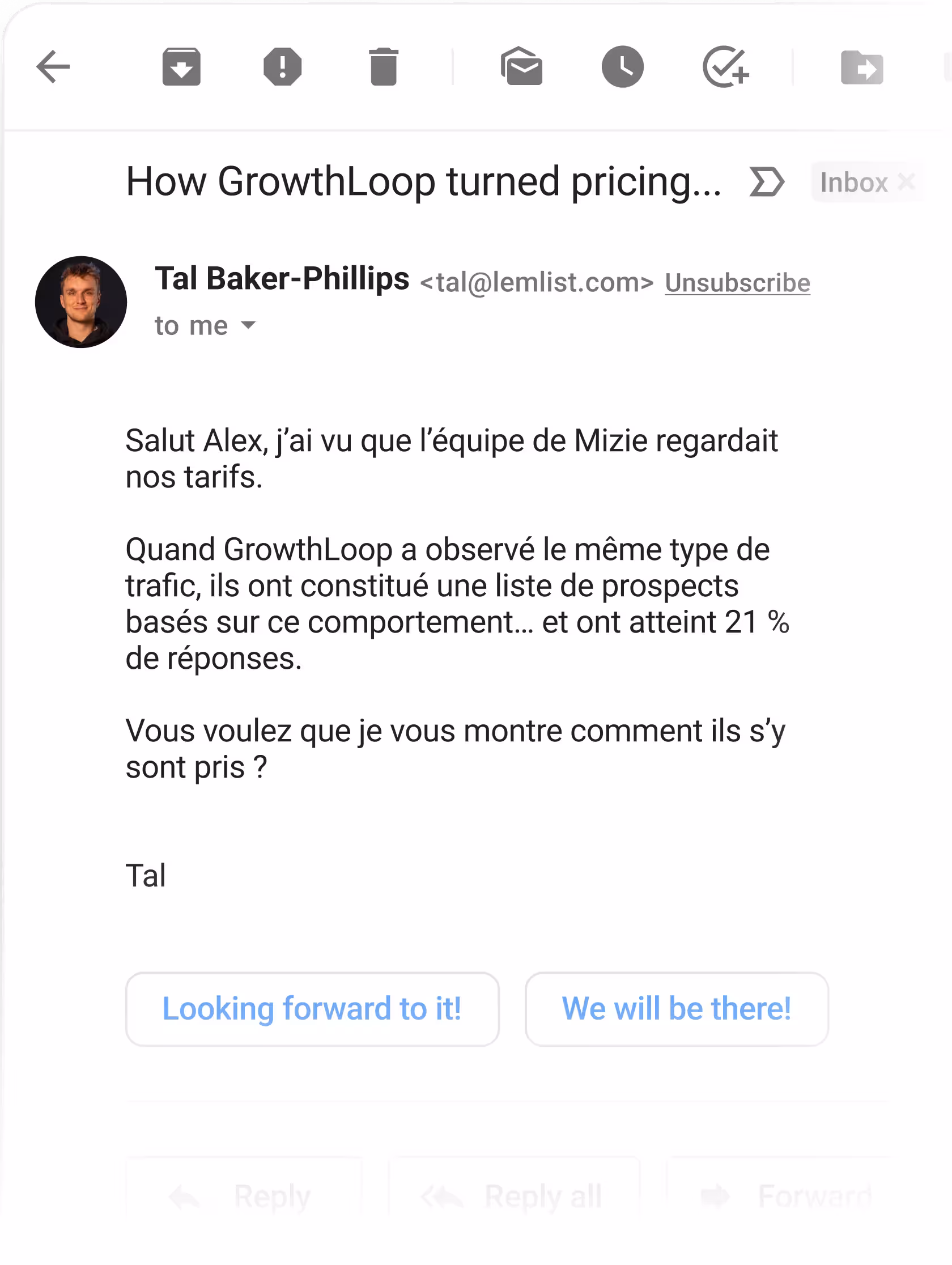 L’IA de lemlist transforme chaque signal détecté en accroche naturelle, fluide et parfaitement calée dans le timing. Aucune action manuelle, et des messages qui suscitent plus d’intérêt… donc plus de réponses.