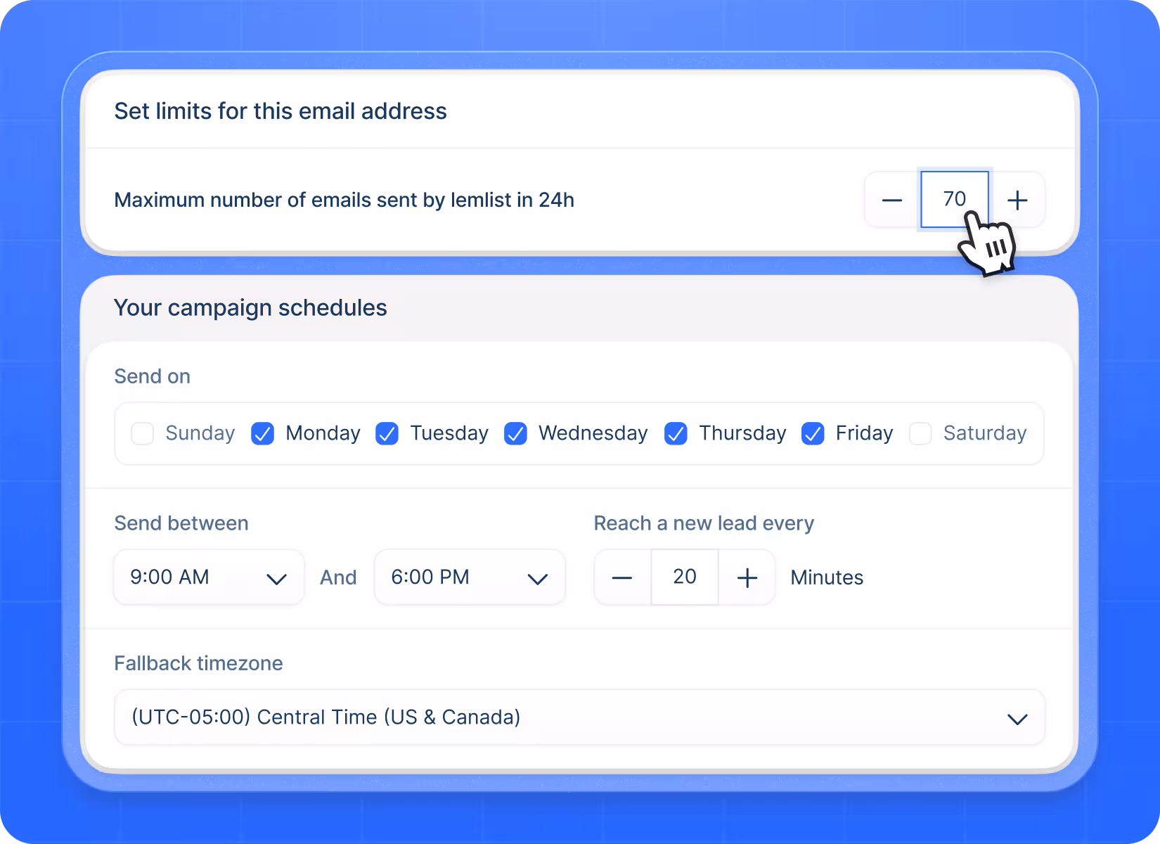 lemlist caps daily sending per inbox and pauses automatically before you hit unsafe limits. Set sending windows by timezone so your emails land when prospects are actually at their desk.