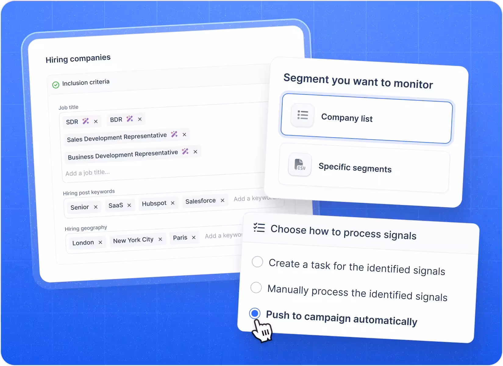 Pick a signal type (like “Company is hiring” or “Visited my website”), define your criteria, and you’re good to go.