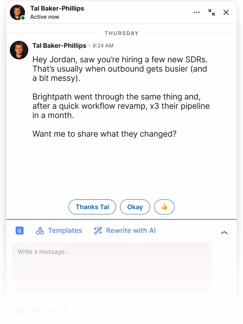 lemlist’s AI turns each detected signal into an icebreaker that feels relevant, human, and perfectly timed - without manual effort. This means messages that spark genuine interest and higher replies, each time.