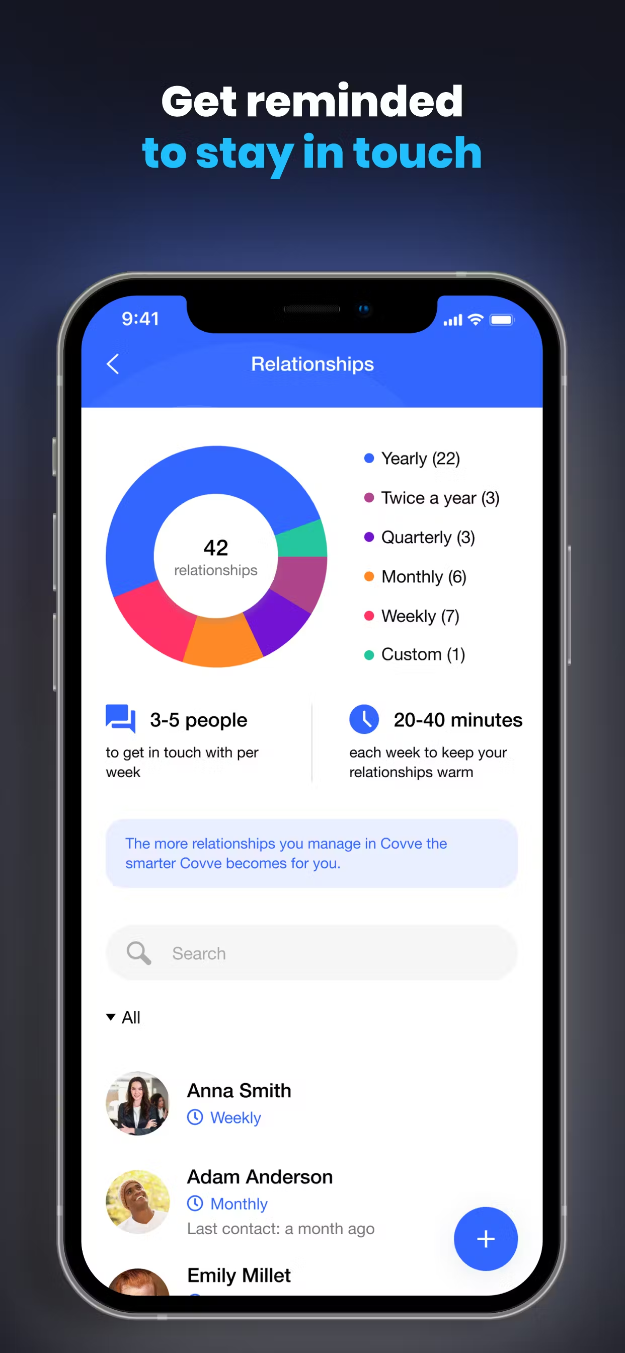 Classificata come la migliore app CRM personale negli Stati Uniti, Covve è utilizzata da professionisti di vari settori, come imprenditori e dirigenti. Aiuta a costruire relazioni significative e a migliorare vita e carriera.