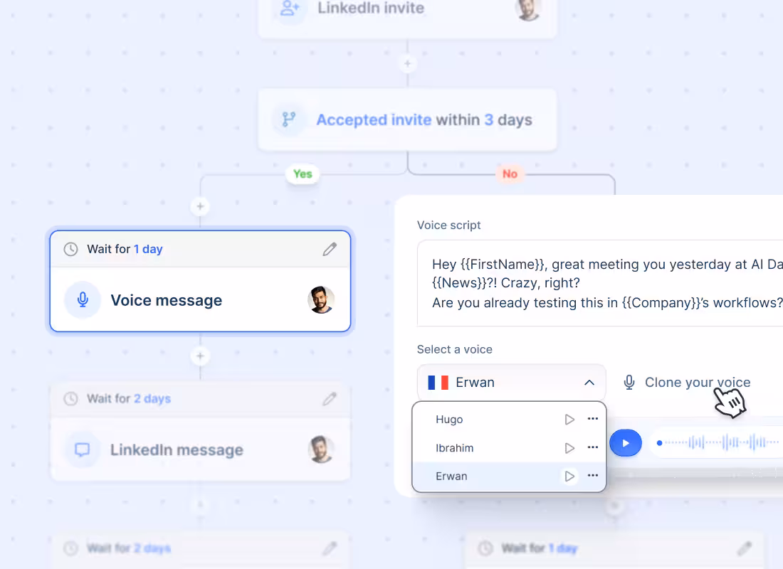 Send LinkedIn connection requests, visit profiles, text, or voice messages on autopilot -without ever leaving lemlist multichannel sequence. Use the lemlist Chrome extension to find, enrich, and export leads into your campaigns in seconds!