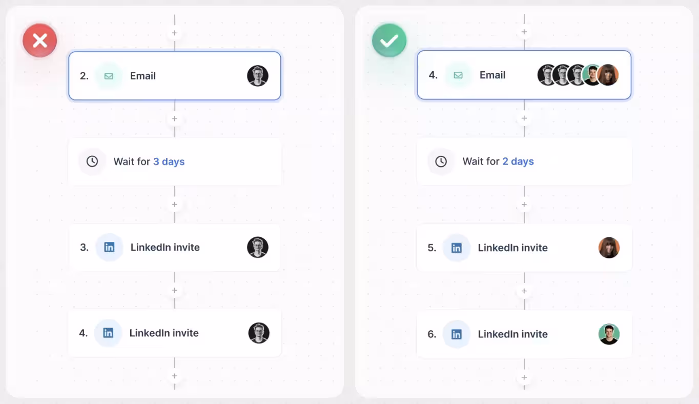 Because prospects might get fatigued seeing repeated messages from the same person, using different accounts helps distribute the outreach and reduces these risks. Plus, it keeps you safe from deliverability troubles and being marked as spam.