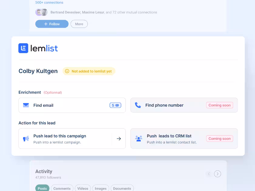 The lemlist Chrome extension allows you to scrape leads’ information and enrich them directly with the extension before pushing them to a campaign. You can even scrape 100 leads’ emails and phone numbers for free.
